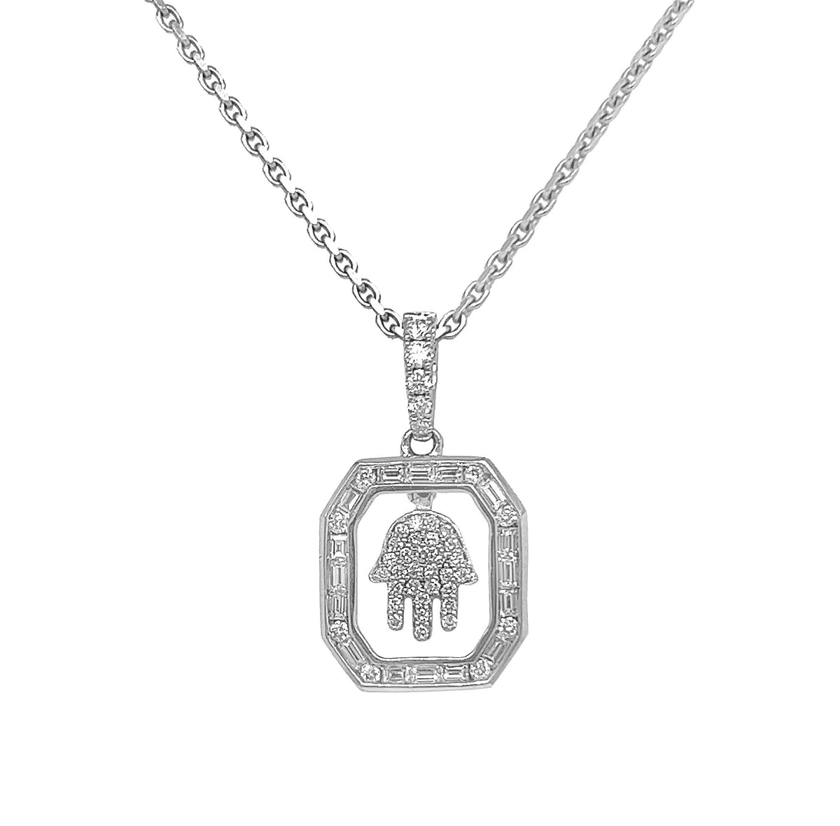 18kt white gold channel set baguette and micro pave set round brilliant diamond hamsa pendant.