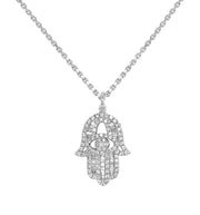 18kt white gold channel set baguette and micro prong set round brilliant diamond double sided hamsa pendant with 14kt white gold cable link chain.