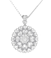 18kt white gold micro prong set and invisble set round brilliant diamond flower cluster pendant with 2 rows of three prong set round brilliants diamond with millgrain etched hearts around each stone