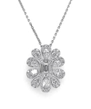 18kt white gold prong and micro prong set baguette, pear and round brilliant diamond flower pendant with 14kt white gold cable link chain.