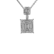 18kt white gold invisible set baguette and round brilliant diamond cluster pendant with 14kt white gold cable link chain.