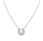 18kt white gold micro prong set baguette and round brilliant diamond horse shoe pendant.