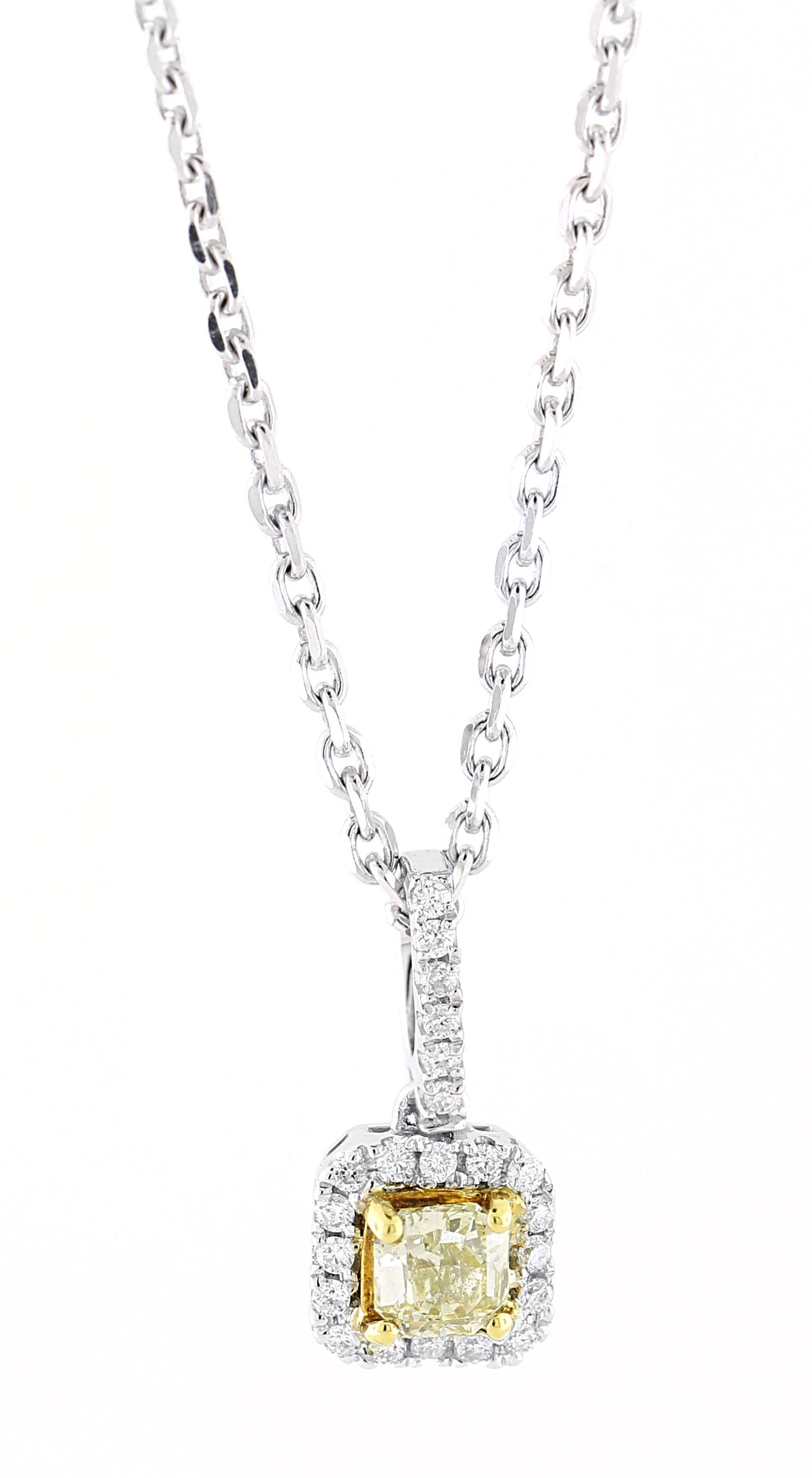18kt White gold Fancy light yellow cushion cut diamond set into center with mutual prong set round brilliant diamond pendant 22-Diaonds=0.13ctw 1-Yellow diamond=0.23ctw