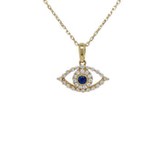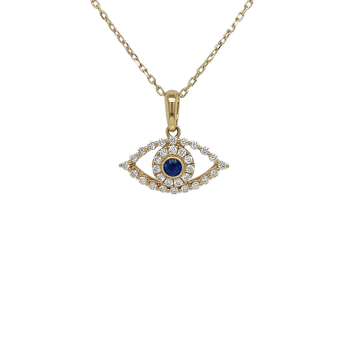 18kt yellow gold prong set round brilliant diamond and blue sapphire evil-eye pendant with 14kt yellow gold cable link chain. 1 blue sapphires = 0.10ctw 31 round diamonds = 0.26ctw