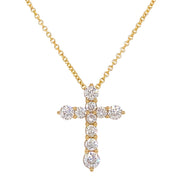 18kt yellow gold mutual prong set round brilliant diamond cross-pendant with 14kt yellow gold cable link chain.