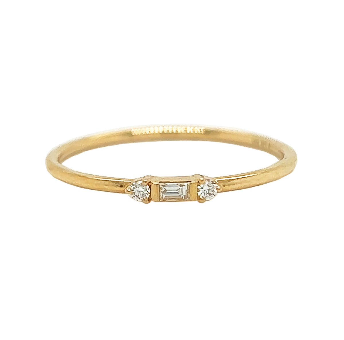 14kt yellow gold channel set baguette and micro prong set round brilliant diamond thin ring.
