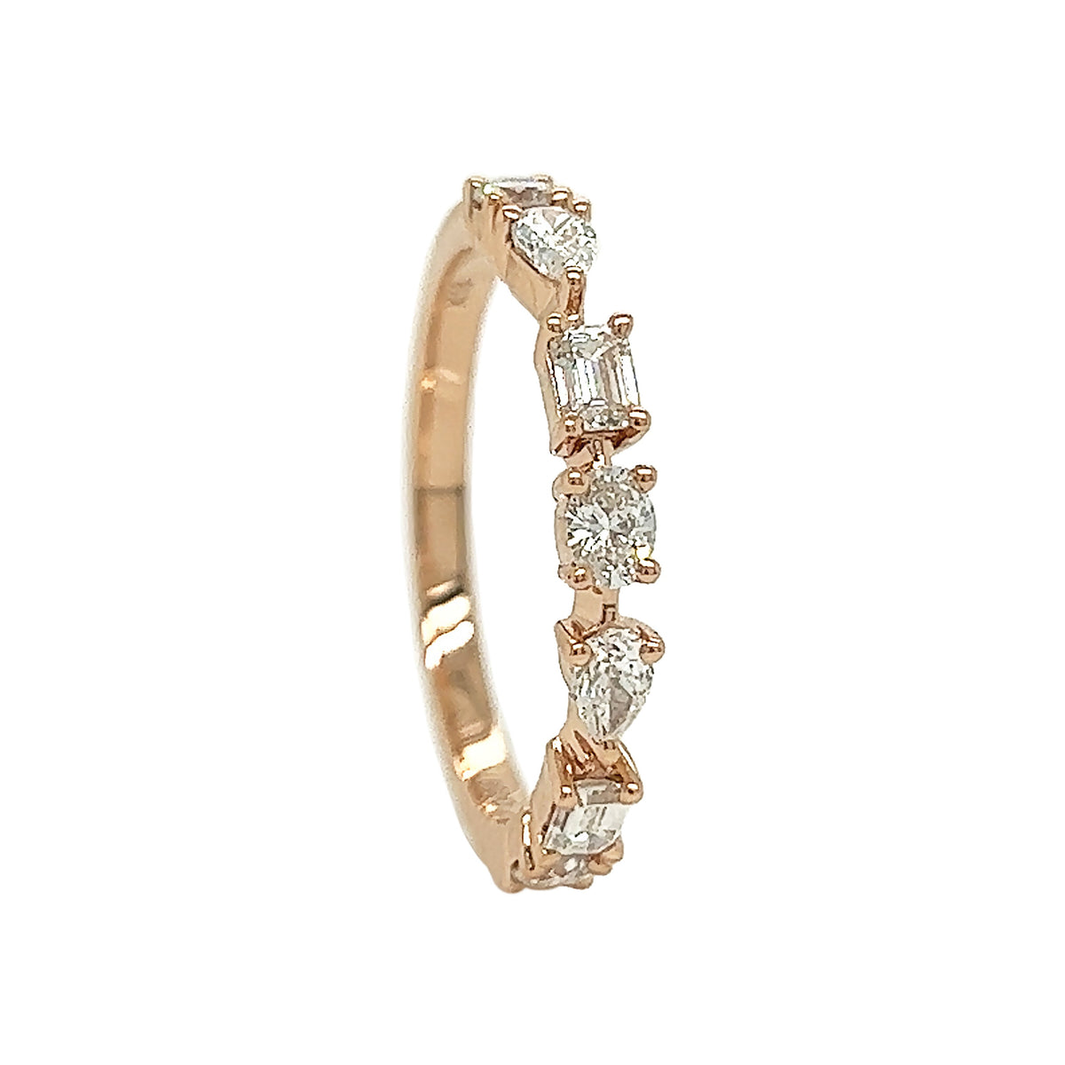 18kt rose gold prong set oval, pear, emerald cut and round brilliant diamond half-way band.