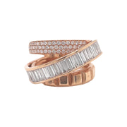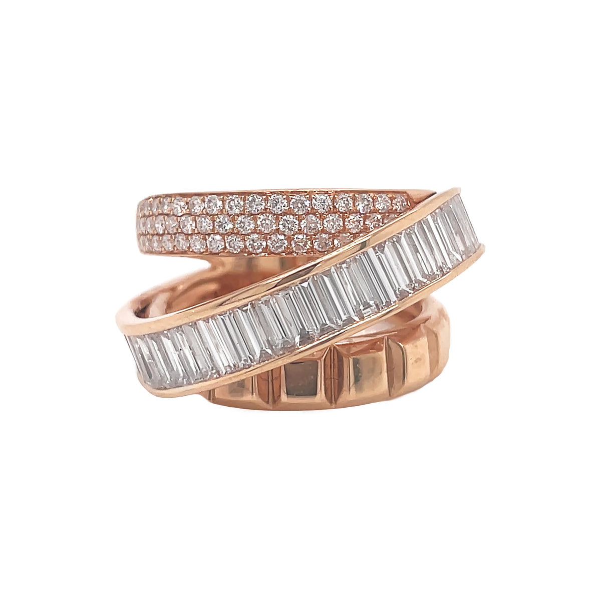 18kt rose gold micro prong set baguette and round brilliant diamond multi-row criss-cross ring.