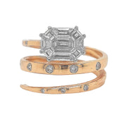 18kt rose gold invisible set emerald cut diamond and flush set round brilliant diamond spiral ring.