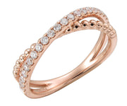 18kt rose gold micro prong set round brilliant diamond and beaded criss-cross ring.