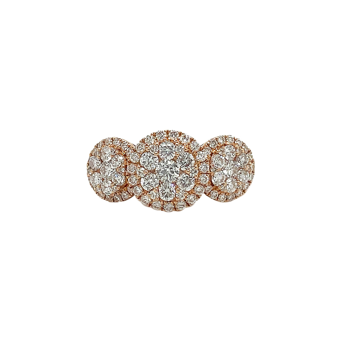 18kt rose gold micro prong set round brilliant diamond 3-cluster ring.