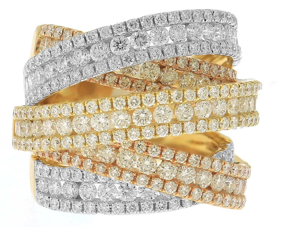 18kt tri-color gold channel set and micro prong set round brilliant diamond multi row criss cross ring