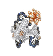 18KT BLACK, WHITE, AND ROSE GOLD MICRO PAVE SET BLUE SAPPHIRE, BLACK, AND WHITE ROUND BRILLIANT DIAMOND SWIRL FISH RING. 62 BLUE SAPPHIRES = 0.67CTW 263 ROUND DIAMONDS = 2.24CTW 2 BLACK DIAMONDS = 0.03CTW