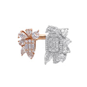 18kt white and rose gold micro prong and prong set baguette, princess, marquise, pear and round brilliant diamond double cluster open ring.