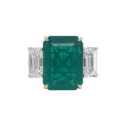 18kt white and yellow gold 4 prong set C.Dunaigre certified green emerald and GIA certified emerald cut diamond 3-stone ring.