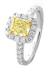 18kt white and yellow gold prong set GIA Certified Cut-Cornered Rectangular Fancy Yellow Diamond with micro prong set round brilliant diamond halo ring