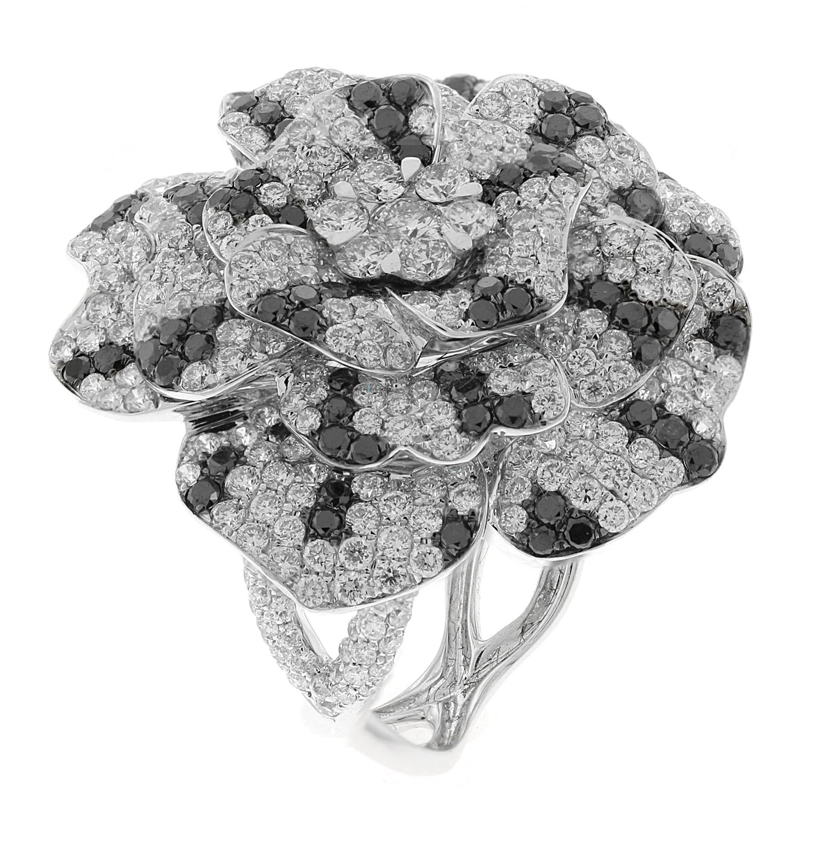 18kt white gold micro prong and prong set round brilliant black diamond and white diamond flower ring with twisted shank. 388 Round diamonds = 3.98ctw 95 Black diamonds = 1.21ctw Size 7.25