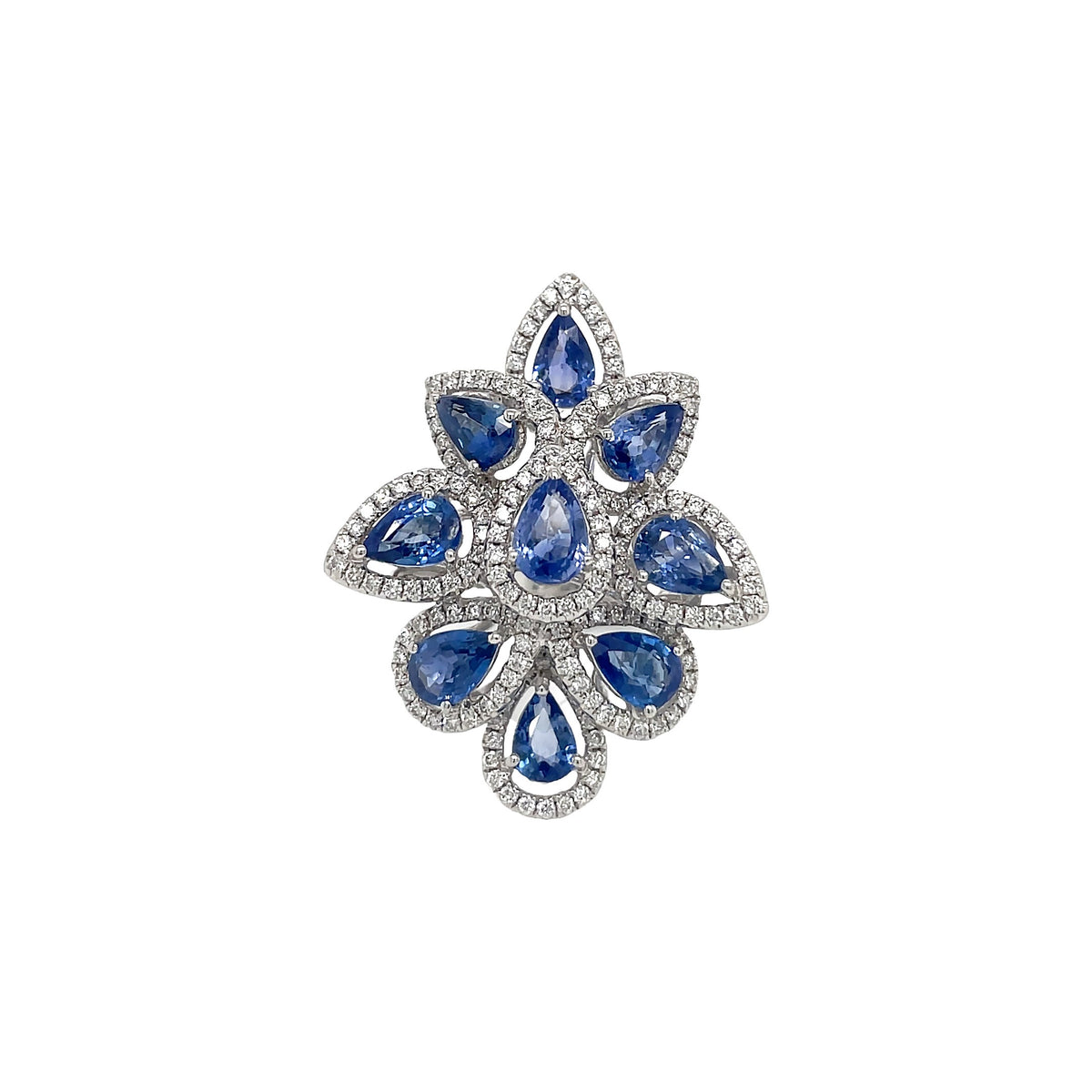 18kt white gold micro prong set round brilliant diamond and 3 prong set blue sapphires cluster ring. 173 round diamonds = 0.90ctw 9 blue sapphires = 4.69ctw Size: 6.5