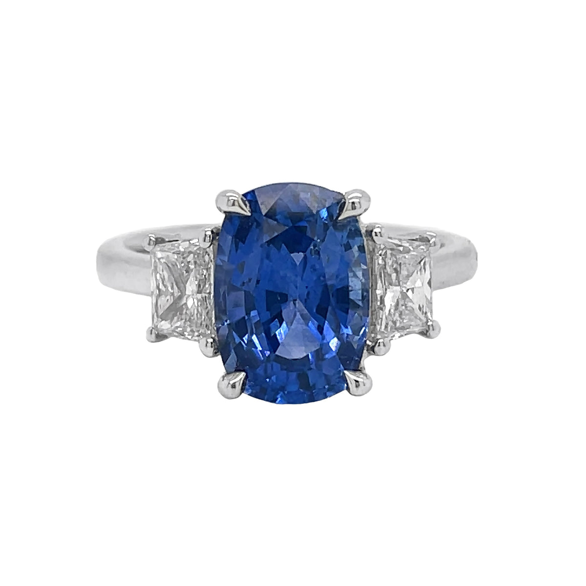 18kt white gold 4 prong set GIA certified cushion shaped blue sapphire ring with 4 prong set trapazoid diamonds on each side.