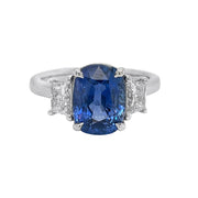 18kt white gold 4 prong set GIA certified cushion shaped blue sapphire ring with 4 prong set trapazoid diamonds on each side.