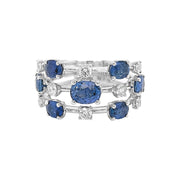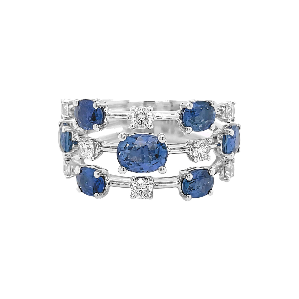 18kt white gold 4 prong set round brilliant diamond and blue sapphire multi-row ring. 6 blue sapphires = 2.30ctw 1 blue sapphires = 0.91ctw 8 round diamonds = 0.55ctw