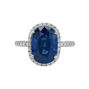 18kt white gold 4 prong set GIA certified blue sapphire ring with micro prong set round brilliant diamond on halo and shank.
