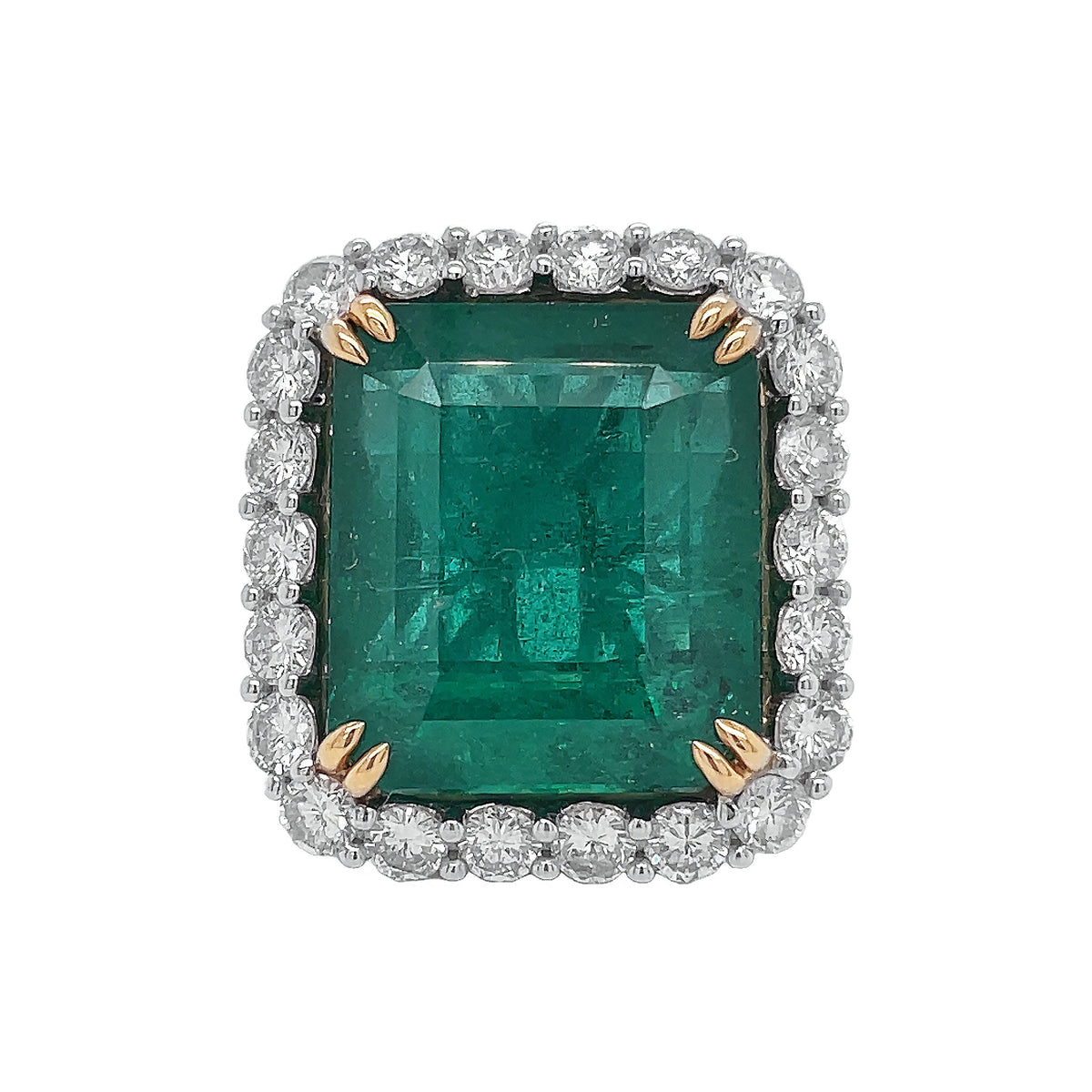 18kt white gold mutual prong set round brilliant diamond octogonal shape emerald ring with square halo and diamond split shank