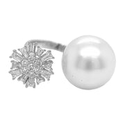 18kt white gold prong set baguette and round brilliant diamond cluster and south sea pearl ring. 7 round diamonds = 0.18ctw 12 baguette diamonds = 0.59ctw South sea pearl: 14.04mm