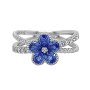 18kt white gold micro prong set round brilliant diamond and invisible set blue sapphire flower ring. 5 blue sapphires = 0.94ctw 13 round diamonds = 0.23ctw Size: 6.5