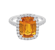 18kt white gold 4 prong set GIA Certified Yellowish Orange Sapphire Ring with micro prong set round brilliant diamond halo and shank.