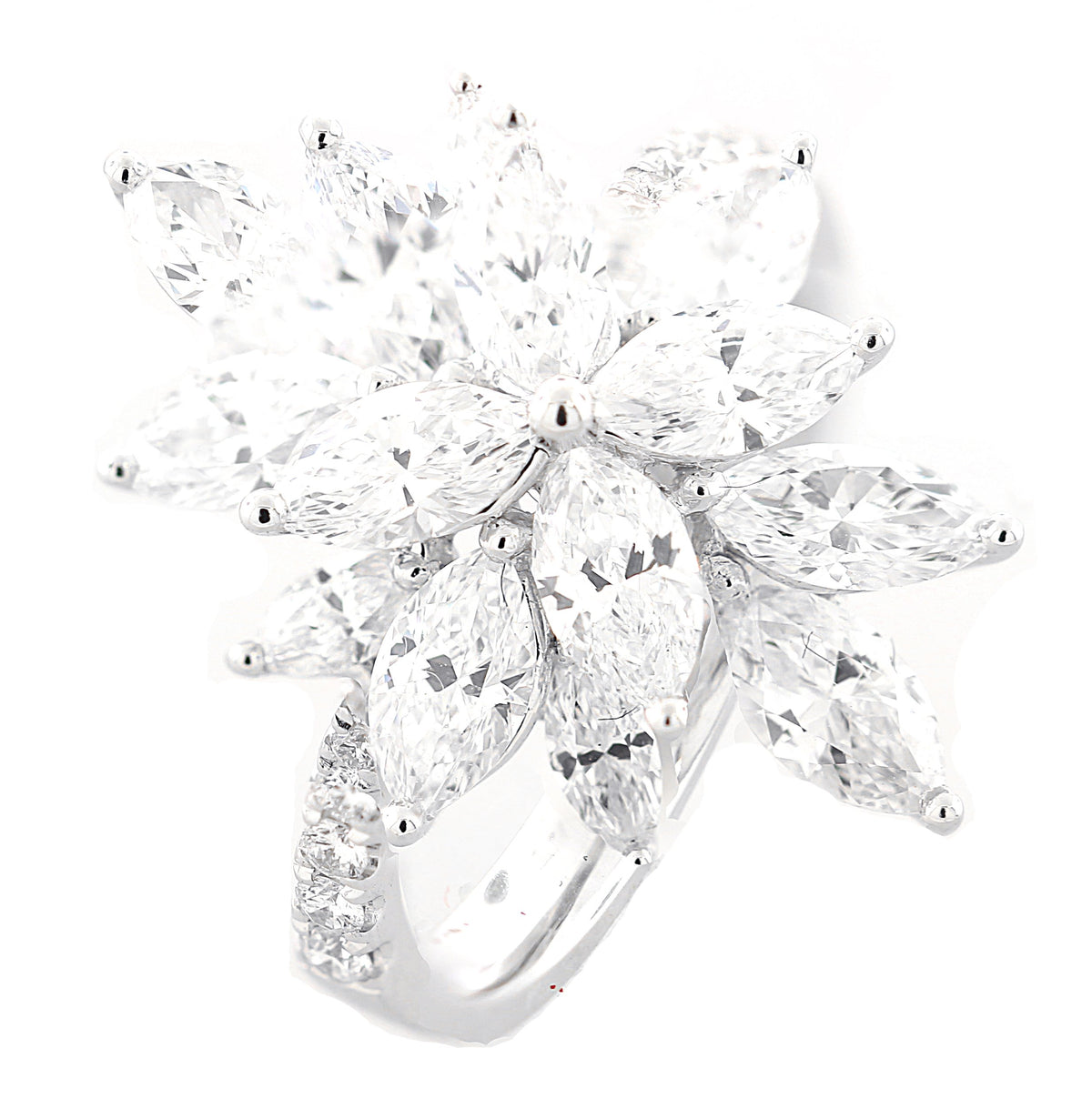 18kt white gold double prong set marquise diamond cluster ring with a micro prong set round brilliant diamond shank