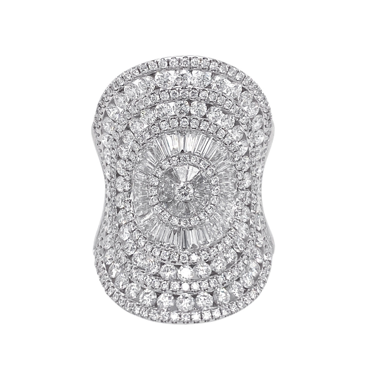 18kt white gold channel and micro prong set baguette and round brilliant diamond fashion ring.