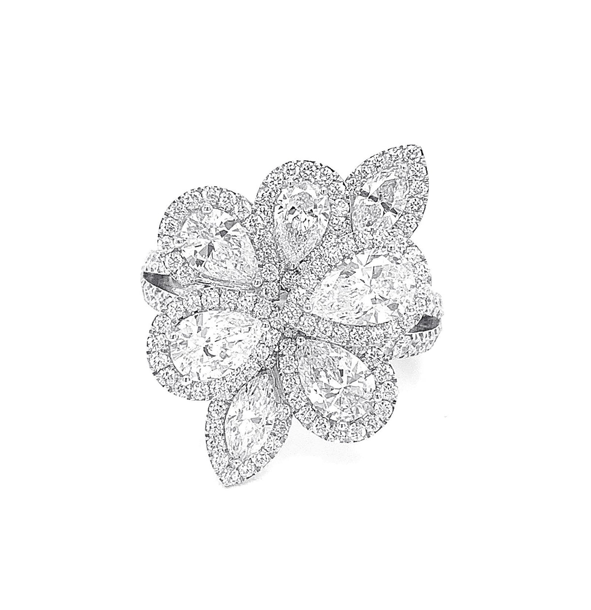 18kt white gold micro prong set round brilliant diamond and prong set marquise and pear shaped diamond cluster fashion ring.
