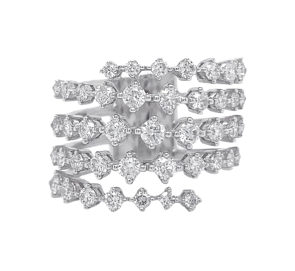 18kt white gold 4 prong set round brilliant diamond multi-row ring.