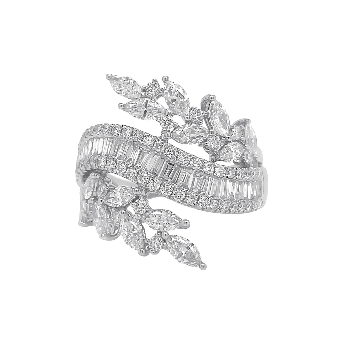 18kt white gold prong set marquise, baguette and round brilliant diamond ring.