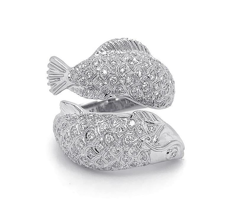 18kt white gold micro pave set round brilliant diamond 2 row fish ring.
