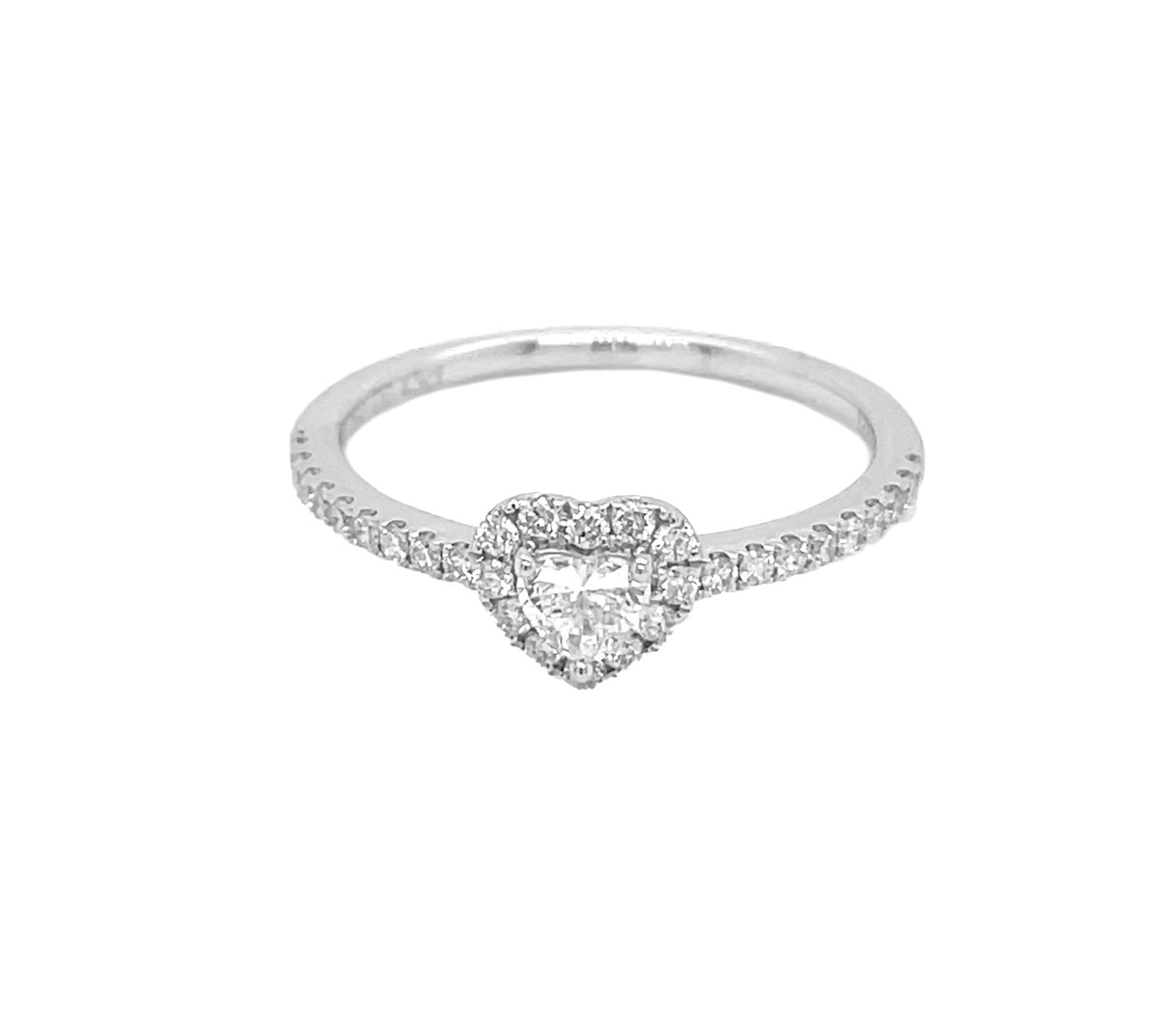 18kt white gold 3 prong set heart and micro prong set round brilliant diamond ring.