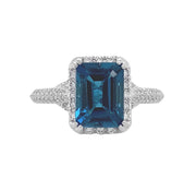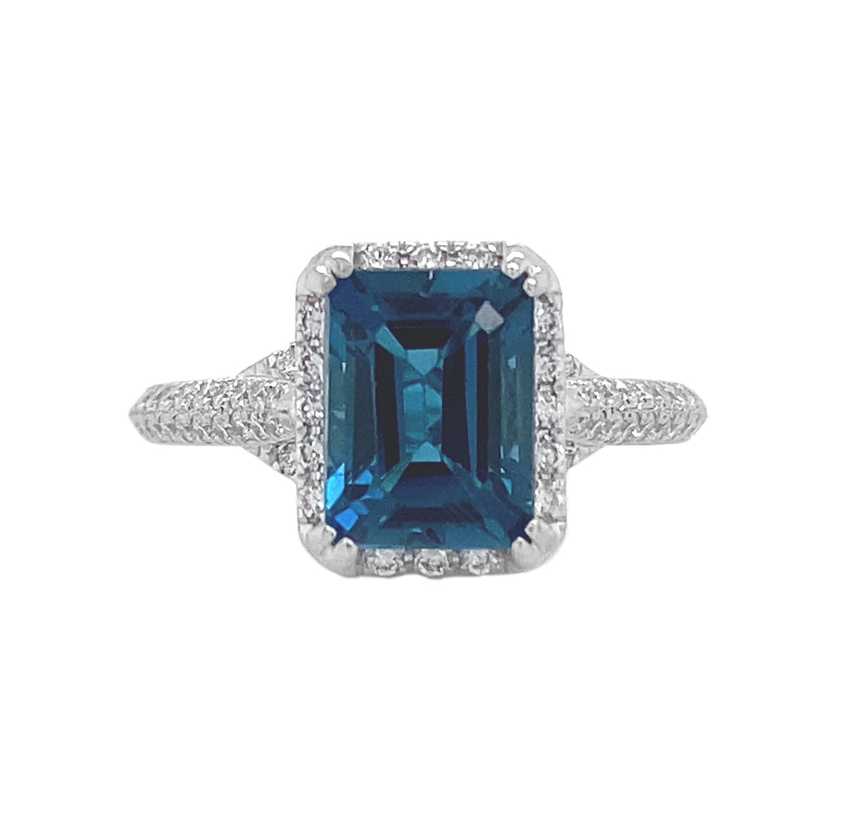 14kt white gold 4 split prong set london blue topaz ring with micro pave set round brilliant diamond gallery and shank. 1 blue topaz = 1.20ctw 100 round diamonds = 0.50ctw Size: 5.25