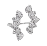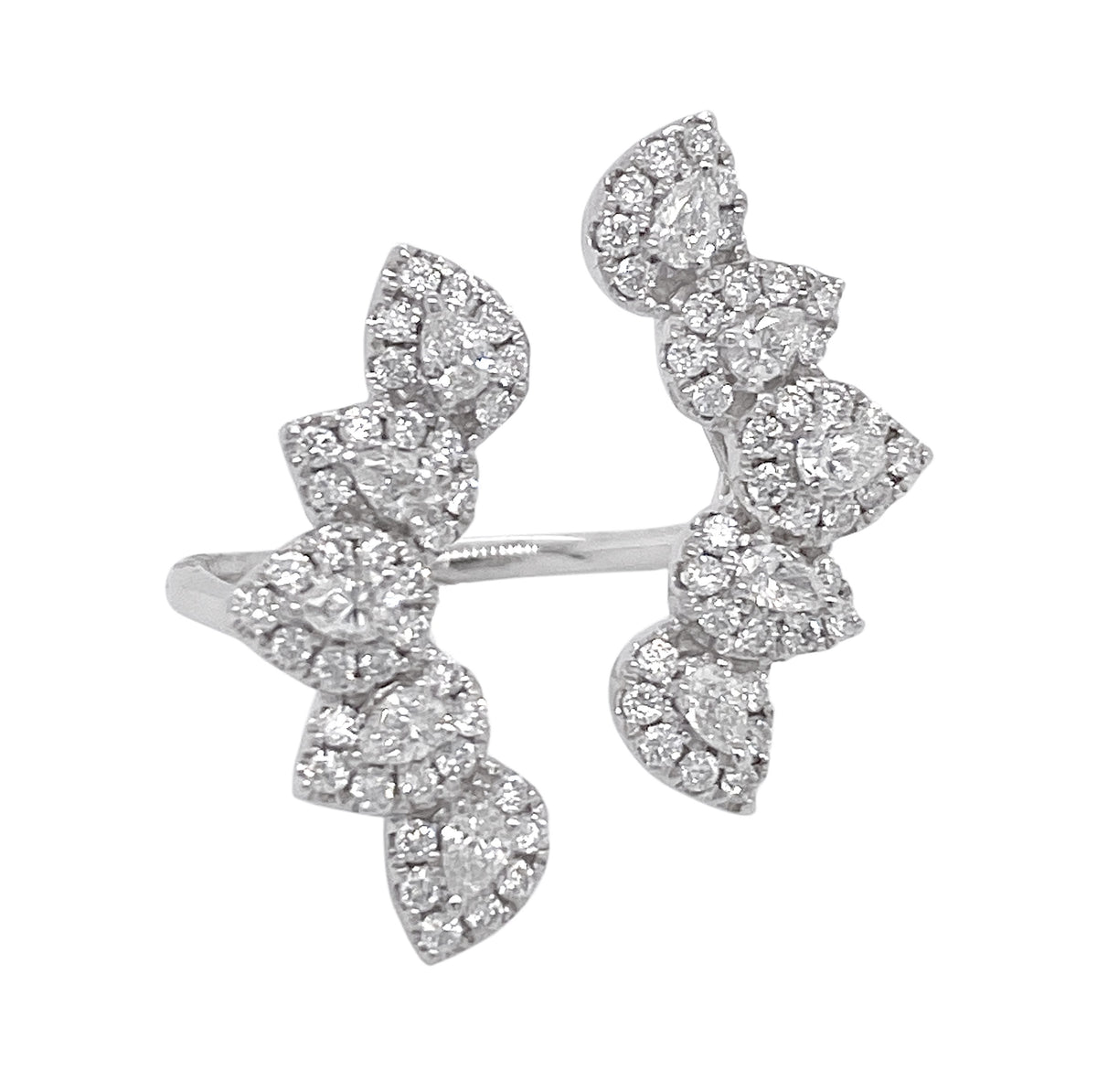 18kt white gold prong set pear cut diamond and micro prong set round brilliant diamond open ring.