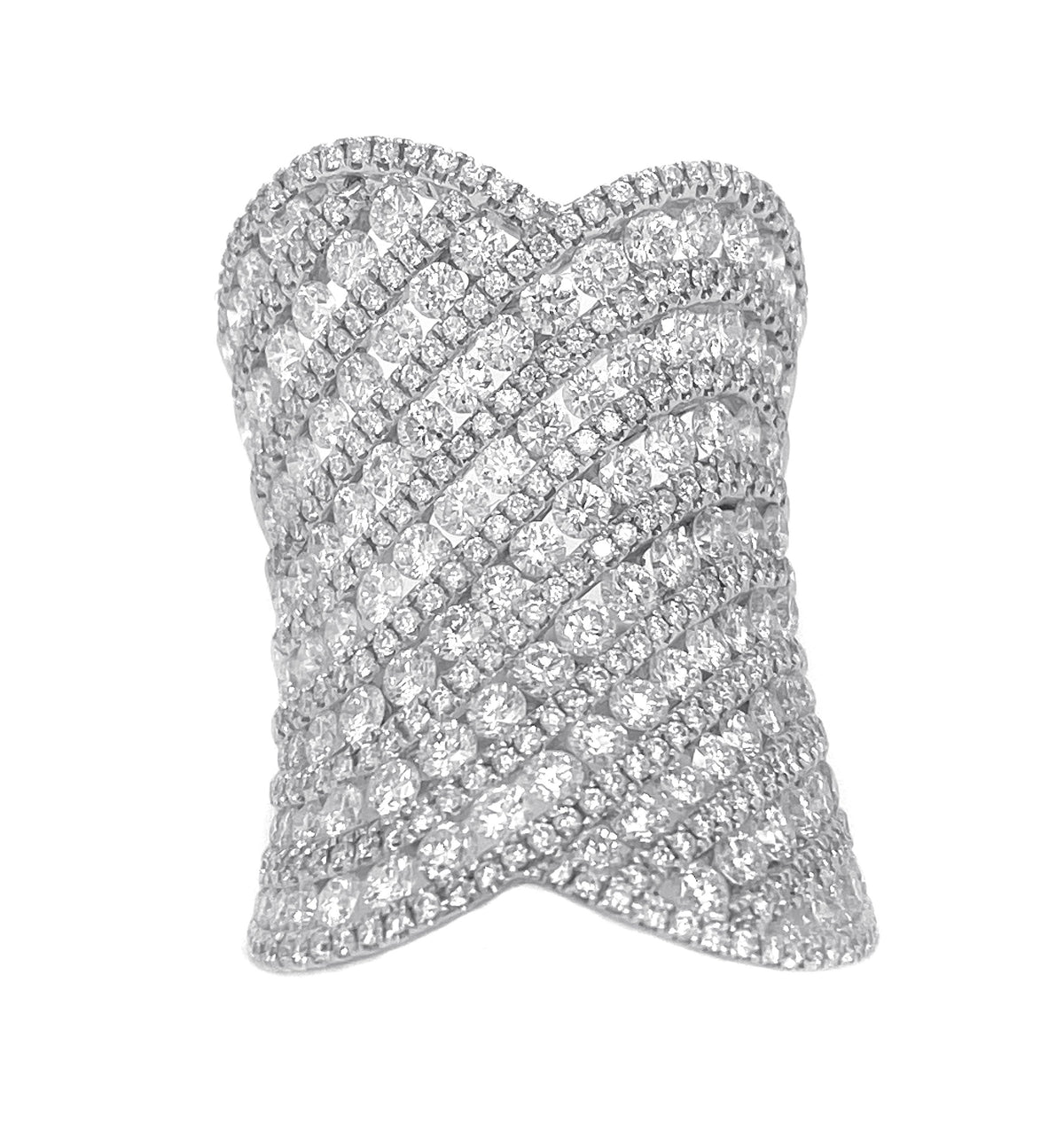 18kt white gold micro prong and channel set round brilliant diamond cocktail ring.