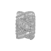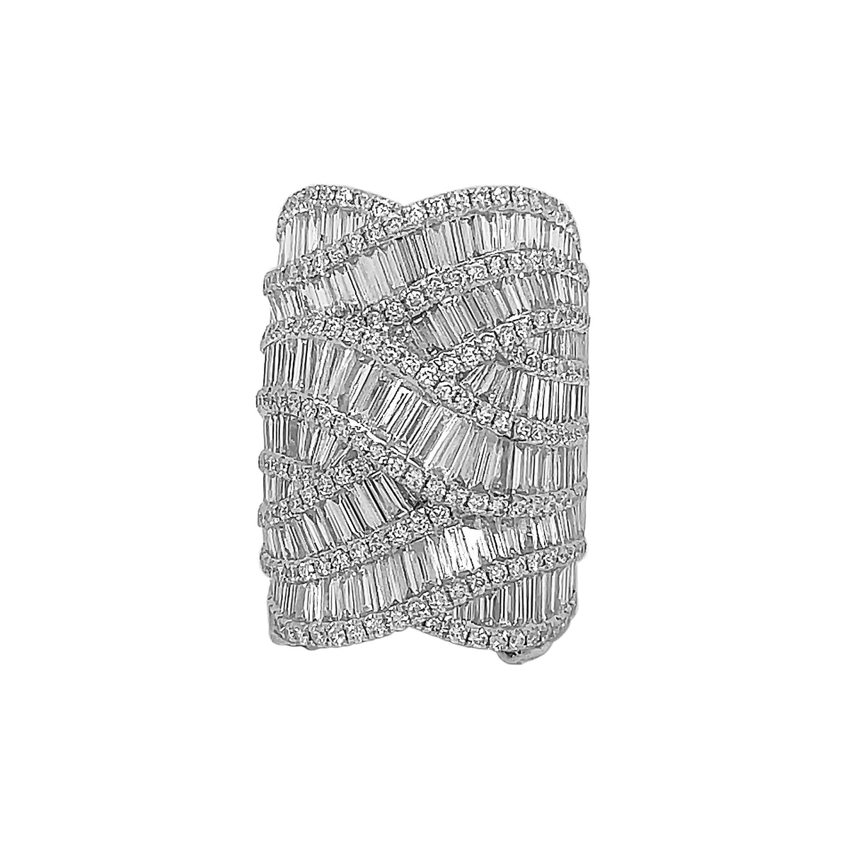 18kt white gold invisible set baguette and micro prong set round brilliant diamond multi-row criss-cross design ring.