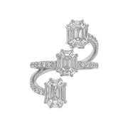 18kt white gold invisible and micro prong set emerald and round brilliant diamond illusion multi-cluster multi-row ring.