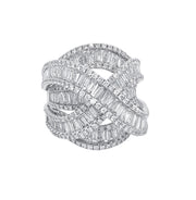 18kt white gold channel set baguette diamond and micro prong set round brilliant diamond multi-row ring.