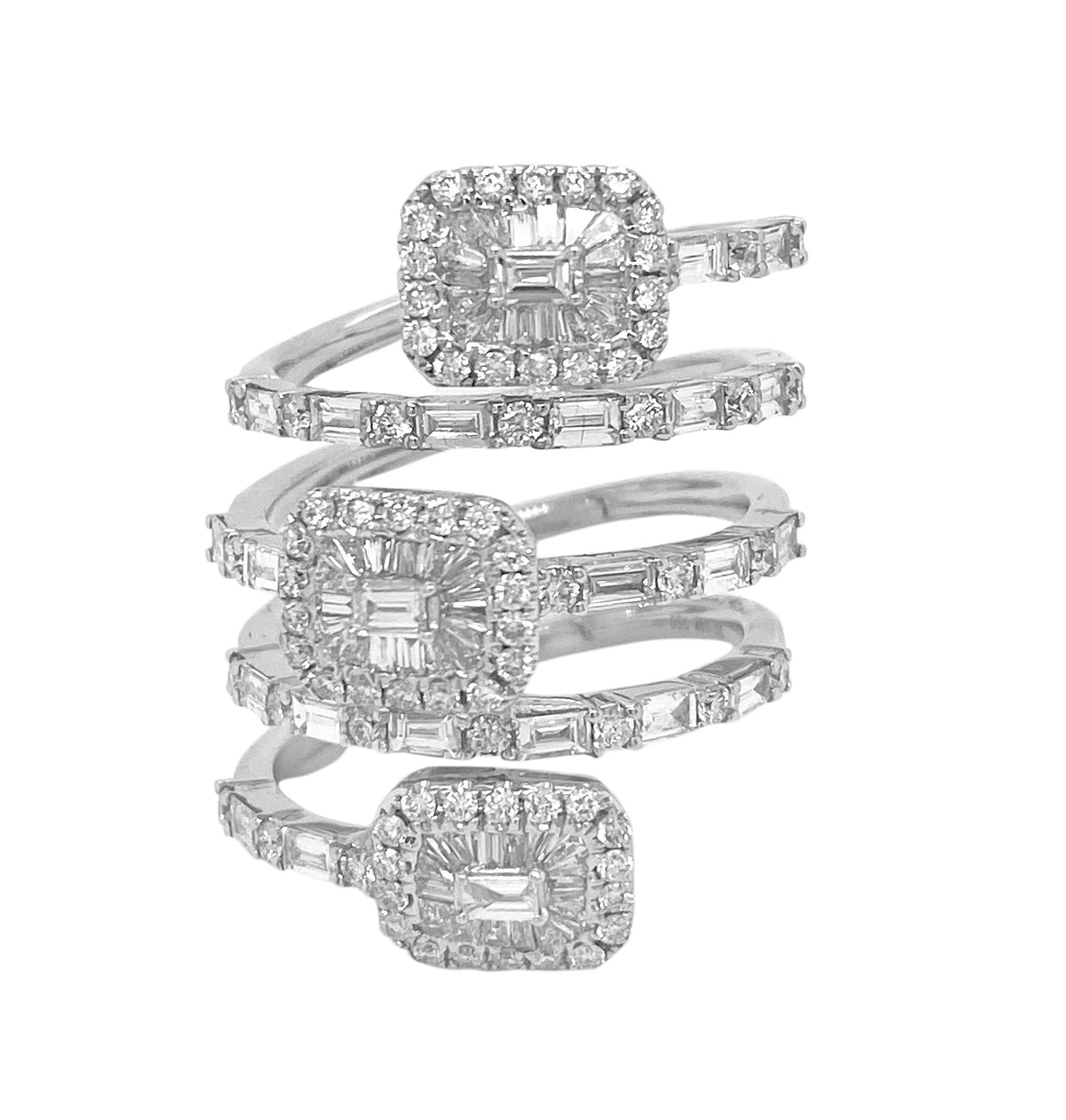 18kt white gold prong set baguette and round brilliant diamond multi-row ring.