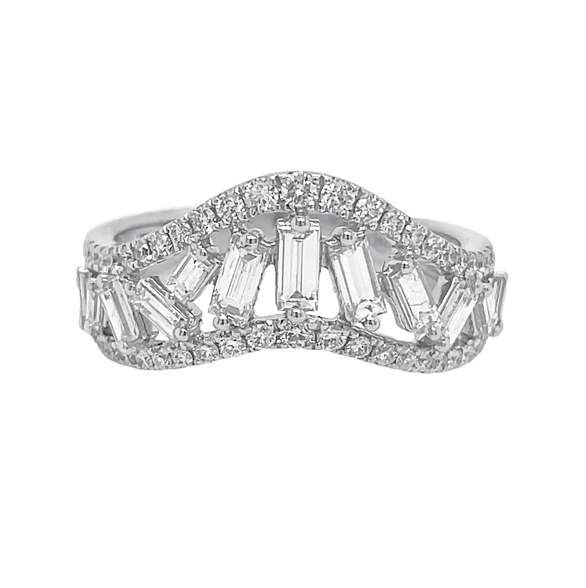 18kt white gold micro prong set baguette and round brilliant diamond curve ring.