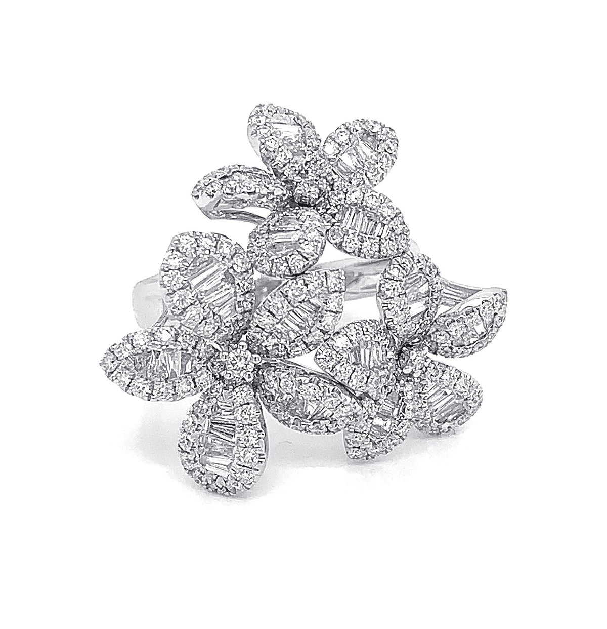 18kt white gold micro prong set round brillaint diamond and channel set baguette diamond 3 flower ring.