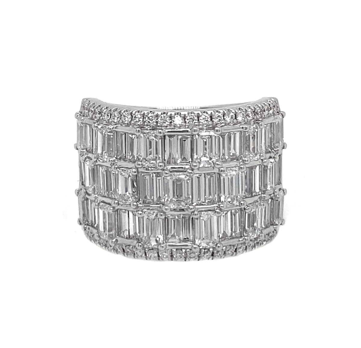 18kt white gold micro prong and channel set baguette and round brilliant diamond wide fashion ring.