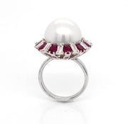 18kt white gold south sea pearl ring with prong set baguette and ruby halo. 11 baguette diamonds = 1.10ctw 11 rubies = 2.31ctw South Sea Pearl = 14.32mm Size: 6.5