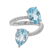 18kt white gold 4 prong set blue topaz and micro prong set round brilliant diamond open ring. 1 blue topaz = 2.44ctw 1 blue topaz = 2.96ctw 21 round diamonds = 0.31ctw Size: 6.5