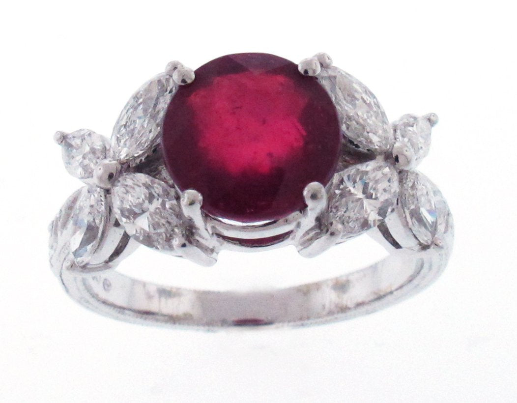 18kt White gold ring with a clarity enhanced round ruby set into center with marquise diamond side stone Marquise diamonds=0.79ctw 1-Ruby=3.08ctw size 6